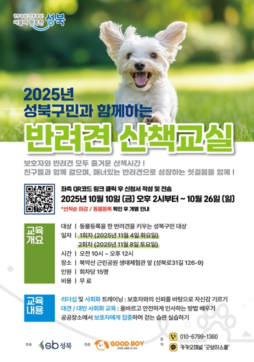 [뉴스시대=김정희 기자] 서울시 성북구가 11월 4일과 8일 전문가와 함께하는 체험형 반려견 산책교육을 실시한다. 이번 교육은 성북구민과 반려견이 함께 참여해 산책 습관과 사회화 훈련을 배우는 프로그램이다.