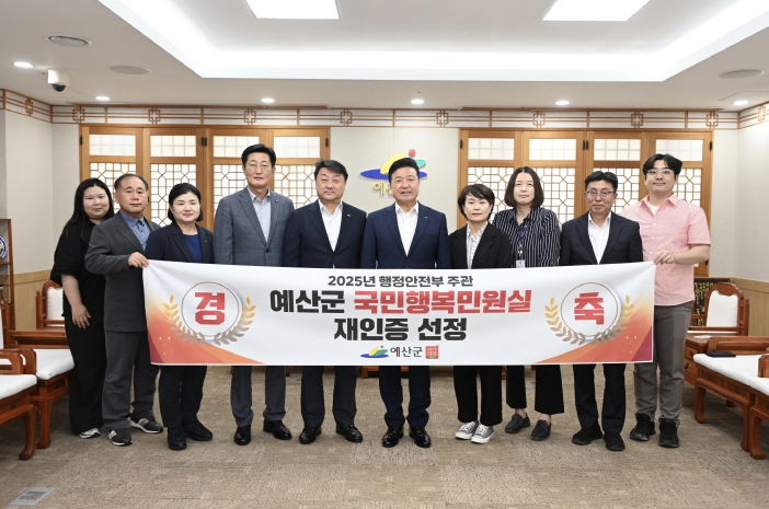 [뉴스시대=김정희 기자] 예산군은 행정안전부가 주관하는 ‘2025년 국민행복민원실’ 평가를 통과해 재인증 기관으로 선정됐다고 17일 밝혔다.