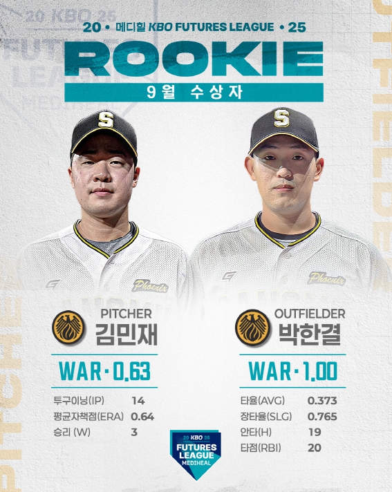 [뉴스시대=김정희 기자] 2025 메디힐 KBO 퓨처스리그의 9월 퓨처스 루키상 수상자로 투수 부문에는 상무 김민재가 WAR 0.63, 타자 부문에는 상무 박한결이 WAR 1.00을 기록하며 각각 선정됐다.