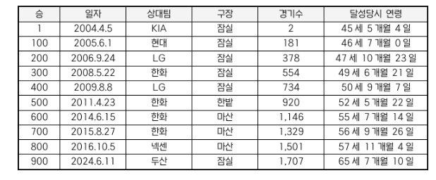 2024시즌 중 한화 감독에 선임되며 KBO 리그에 복귀한 김경문 감독은 2024년 6월 11일 잠실 두산전에서 자신의 통산 900번째 승을 달성한 바 있다.