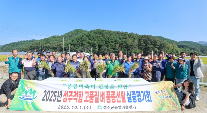 [뉴스시대=김정희 기자] 성주군농업기술센터는 10월 1일 성주군 수륜면 소재 벼 품종비교포에서 성주군 쌀전업농회를 비롯한 농업인과 관계자 등 50여 명이 참석한 가운데 '2025년 고품질 벼 품종선발 실증시험포 평가회'를 개최했다.