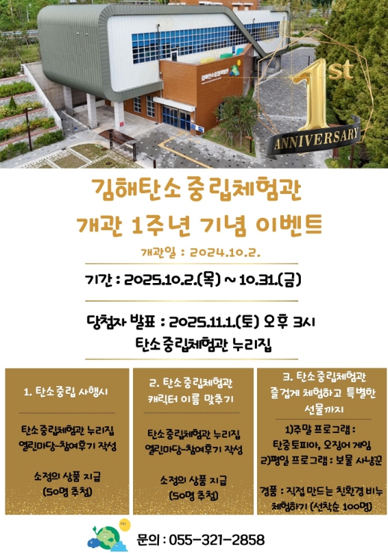 [뉴스시대=김정희 기자] 김해시는 김해탄소중립체험관 개관 1주년을 맞아 2일부터 31일까지 한 달간 특별 기념 이벤트를 운영한다. 이번 이벤트는 온라인과 오프라인 어디든 자유롭게 참여할 수 있다.