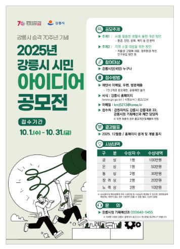[뉴스시대=김정희 기자] 강릉시는 강릉시 승격 70주년을 맞아 시민의 창의적이고 혁신적인 의견을 시정에 반영하기 위해 ‘2025년 강릉시 시민 아이디어 공모전’을 10월 1일부터 10월 31일까지 31일간 개최한다.