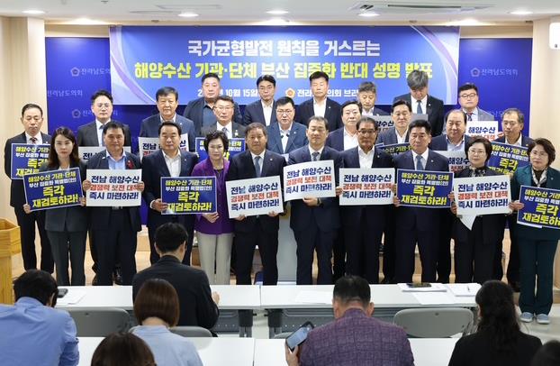 [뉴스시대=김정희 기자] 전라남도의회 농수산위원회 최동익 의원(더불어민주당·여수)은 10월 15일 제394회 임시회 도의회 브리핑룸에서 '국가균형발전 원칙을 거스르는 해양수산 기관·단체 부산 집중화 반대 성명서'를 발표했다.