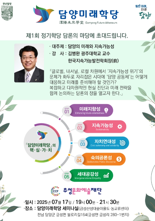 [뉴스시대=김정희 기자] 추성문화예술재단은 오는 7월 17일 저녁 7시, 전남 담양군 금성면 금성산성대숲마을도·농교류센터(담양미래학당 세미나실)에서 ‘담양의 미래와 지속가능성’을 주제로 제1회 담양미래학당 정기학당을 개최한다.