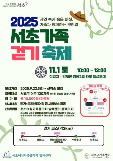 [뉴스시대=김정희 기자] 서울 서초구는 서초여성가족플라자 방배센터, 서초구 가족센터와 함께 11월 1일 서울의 대표적인 생태하천인 양재천에서 ‘2025 서초가족 걷기 축제’를 개최한다고 밝혔다.