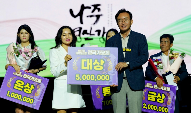 ▲ 윤병태 시장(오른쪽)이 ‘제17회 나주 영산강 전국 가요제’에서 대상을 수상한 장성희 씨에게 상금 500만 원을 전달하고 기념사진을 찍고 있다. |