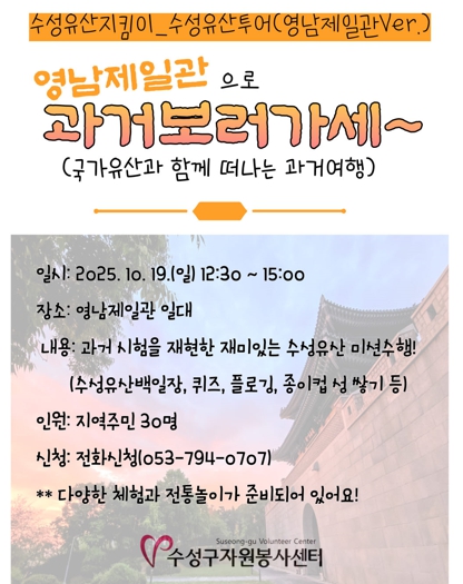[뉴스시대=김정희 기자] 수성구자원봉사센터 소속 수성유산지킴이는 오는 19일 영남제일관 일대에서 지역 주민을 대상으로 한 문화 체험 프로그램 ‘영남제일관으로 과거 보러 가세’를 진행한다.