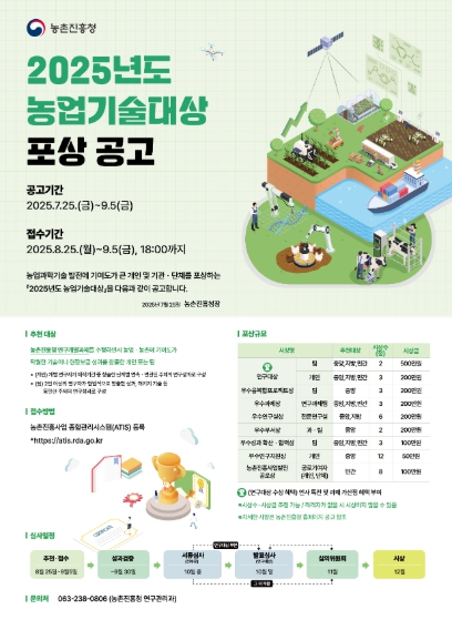 [뉴스시대=김정희 기자] 농촌진흥청은 농업과학기술 발전에 크게 기여한 개인 또는 기관・단체를 포상하는 ‘2025년도 농업기술대상’ 후보자 추천을 공모한다.