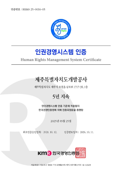 제주개발공사는 지난 2021년 도내 기관 최초로 인증을 취득한 이후, 매년 인권존중 문화 확산과 인권경영 체계 고도화를 추진해 왔다. 이러한 노력이 인정되어 올해 5년 연속 인증 유지라는 성과를 얻었다.