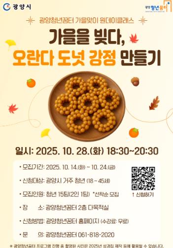 [뉴스시대=김정희 기자] 광양시는 청년들의 여가문화 활성화와 정서적 힐링을 위한 프로그램의 일환으로, 광양청년꿈터에서 가을맞이 원데이클래스 ‘가을을 빚다 – 오란다 도넛 강정 만들기’ 참가자를 모집한다고 14일 밝혔다.