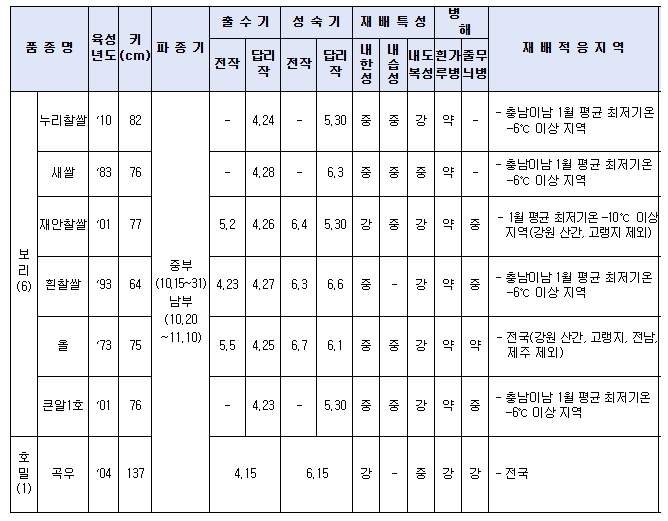 ▲ '25년도 보리·호밀 보급종 품종특성표 |