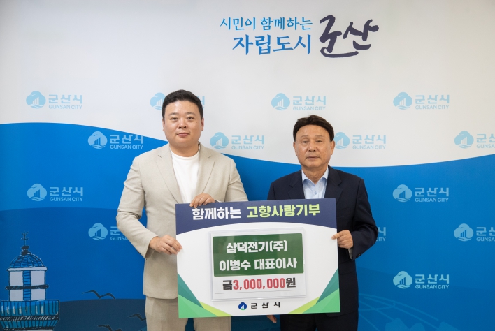 [뉴스시대=김정희 기자] 군산시는 삼덕전기(주) 이병수 대표이사가 고향사랑기부금 300만 원을 기탁했다고 밝혔다.