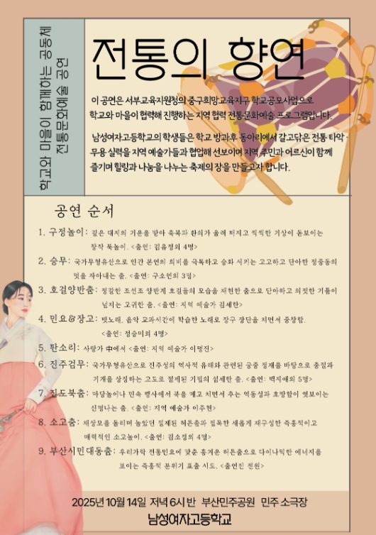 [뉴스시대=김정희 기자] 부산 중구는 '학교와 마을이 함께하는 중구희망교육지구'사업의 일환으로 오는 10월 14일 오후 6시 30분, 부산민주공원 민주소극장에서 남성여자고등학교와 지역예술인이 함께하는 전통문화예술공연‘전통의 향연’이 개최된다고 밝혔다.