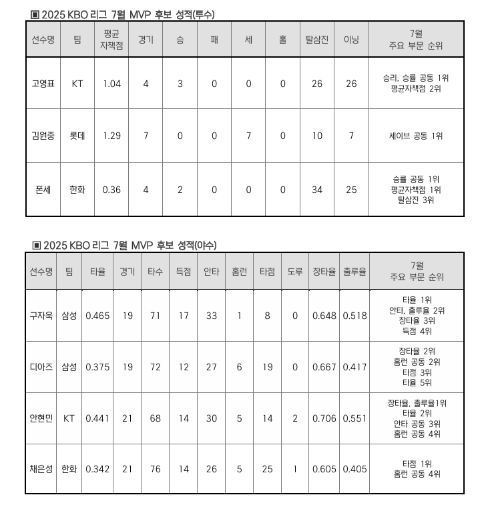 ▲ 2025 신한 SOL뱅크 KBO 리그 7월 월간 MVP 후보 성적 |