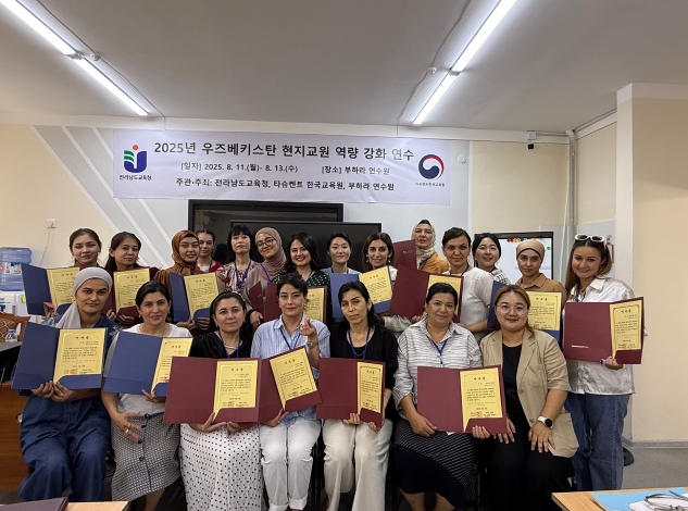 김종만 글로컬교육협력과장은 “전남의 놀이 중심 한국어교육이 우즈베키스탄 교원의 수업 역량을 높이고, 현지 학생들이 한국어와 한국문화를 더 깊이 이해하는 계기가 되길 바란다.”며 “앞으로도 전남의 우수한 교육 사례를 해외에 널리 전하고, 교육 교류의 폭을 넓혀 가겠다”고 말했다.