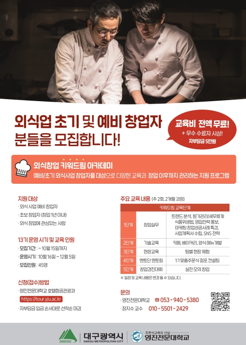[뉴스시대=김정희 기자] 대구광역시는 외식업 예비창업자와 초기 창업자의 안정적 정착을 지원하기 위해 외식창업 ‘키워드림’ 아카데미 13기 참가자를 10월 15일까지 모집한다.