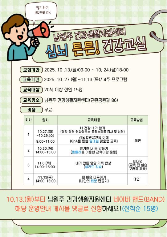 [뉴스시대=김정희 기자] 남원주건강생활지원센터는 심뇌혈관질환의 이해·예방과 건강관리를 돕기 위해 10월 27일부터 11월 13일까지 ‘심뇌 튼튼! 건강교실’을 운영한다.