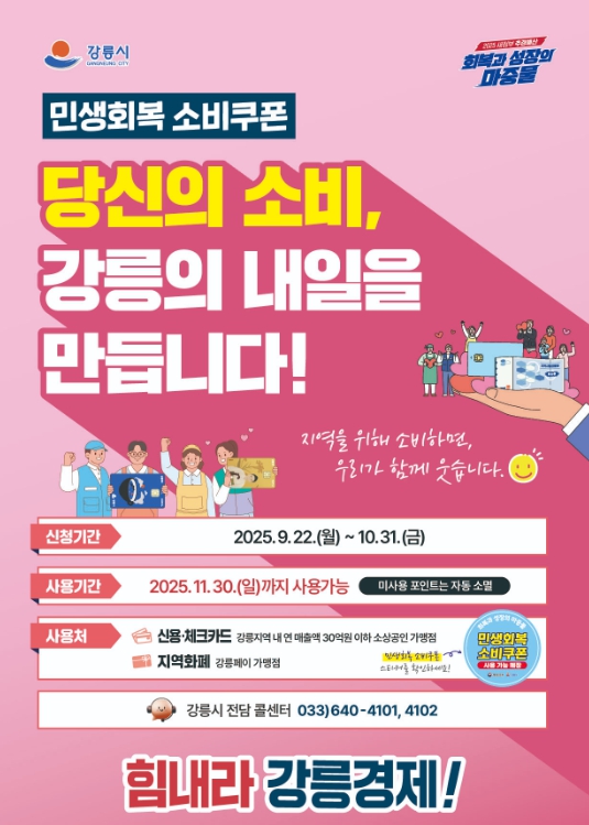 [뉴스시대=김정희 기자] 강릉시 민생회복 소비쿠폰 2차 신청·지급률이 85%로 순항 중인 가운데, 시는 1일부터 10일까지 민생회복 소비쿠폰 2차 소비촉진주간을 운영한다.