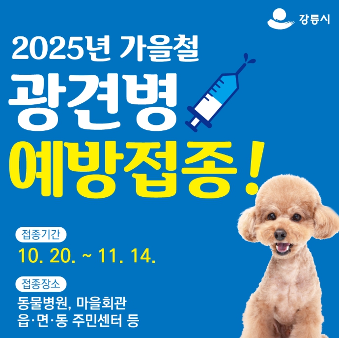 [뉴스시대=김정희 기자] 강릉시는 인수공통전염병으로 알려진 광견병으로부터 시민과 반려동물을 안전하게 보호하기 위해 오는 10월 20일부터 11월 14일까지 4주간 가을철 광견병 예방접종을 실시한다.