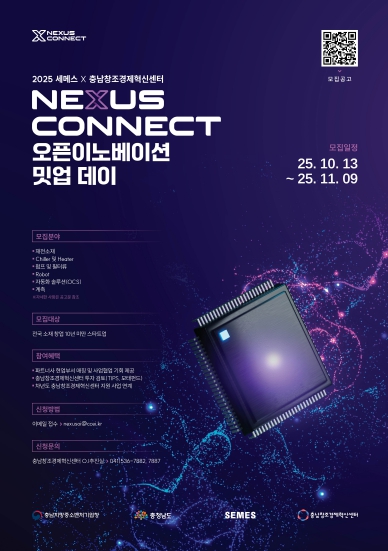 [뉴스시대=김정희 기자] (재)충남창조경제혁신센터와 세메스(주)는 반도체·디스플레이 장비 혁신을 이끌 유망 스타트업을 발굴·육성하기 위해 ‘2025 세메스 × 충남창조경제혁신센터 Nexus Connect 오픈이노베이션 밋업 데이’ 참여 기업을 11월 9일까지 모집한다.