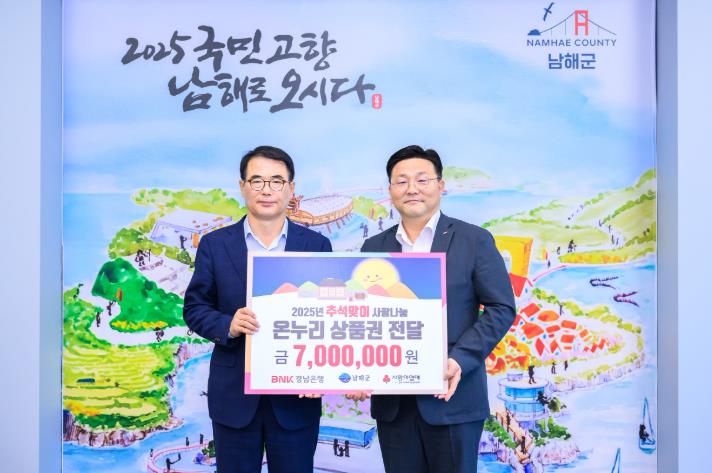 [뉴스시대=김정희 기자] 남해군은 지난 30일 BNK경남은행 남해지점이 추석 명절을 앞두고 700만원 상당의 온누리상품권을 기탁했다고 밝혔다.