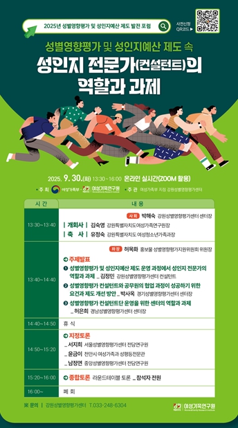 [뉴스시대=김정희 기자] 강원특별자치도여성가족연구원에서는 9월 30일 오후 1시 30분, 온라인 실시간(ZOOM활용)으로 ‘2025년 성별영향평가 및 성인지예산 제도 발전 포럼’을 개최했다.