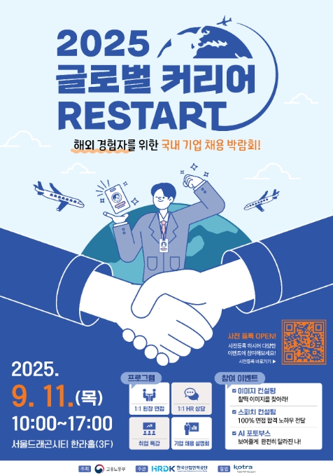 [뉴스시대=김정희 기자] 고용노동부와 한국산업인력공단은 대한무역투자진흥공사(KOTRA)와 협업하여 '025 글로벌 커리어 리스타트'채용박람회를 11일 서울드래곤시티 한라홀(서울 용산구)에서 개최한다.