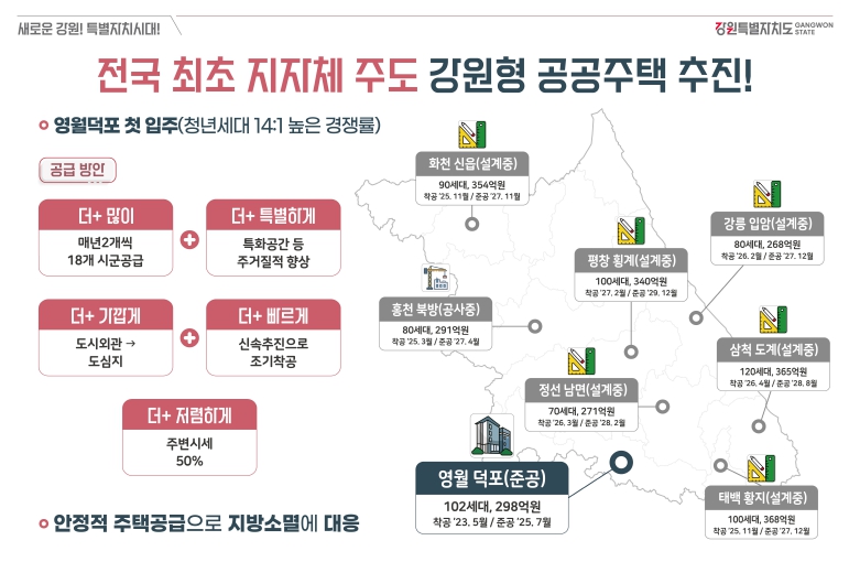 [뉴스시대=김정희 기자] 강원특별자치도는 청년과 신혼부부 등 지역 정착 인구 확대를 위한 안정적인 주택공급을 목표로 전국 최초의 지자체 주도형 주거모델인 강원형 공공주택 사업을 적극 추진하고 있다고 밝혔다.