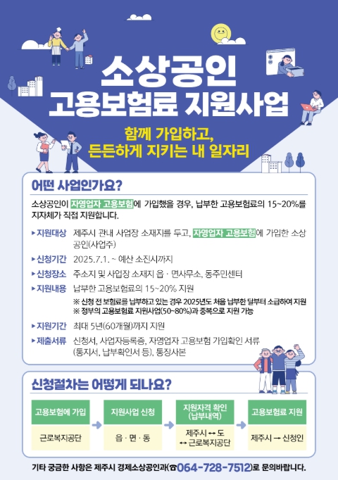 소상공인 고용보험료 지원사업은 제주시에 사업장을 둔 소상공인 가운데 ‘자영업자 고용보험’에 가입한 사업주를 대상으로 하며, 매월 납부한 고용보험료의 15~20%를 최대 5년간(60개월) 지원한다.