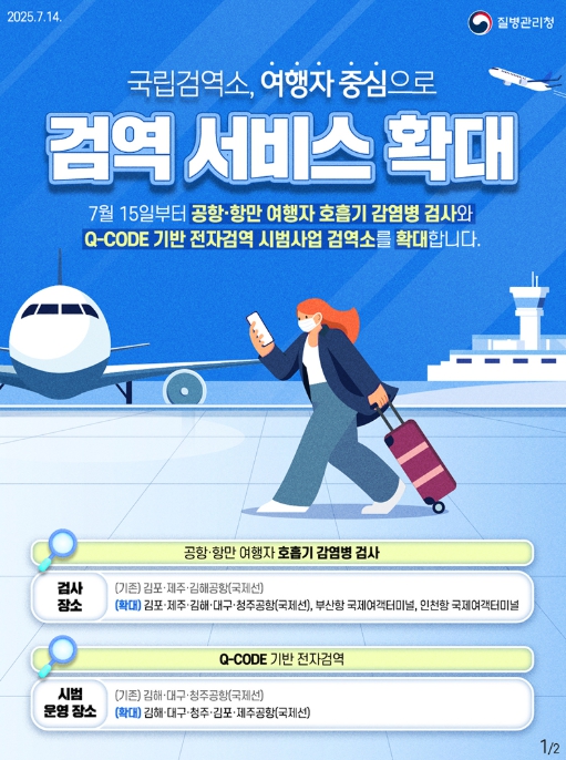 [뉴스시대=김정희 기자] 7월 15일부터 공항·항만 여행자 호흡기 감염병 검사와 Q-CODE 기반 전자검역 시범사업 검역소를 확대합니다.
