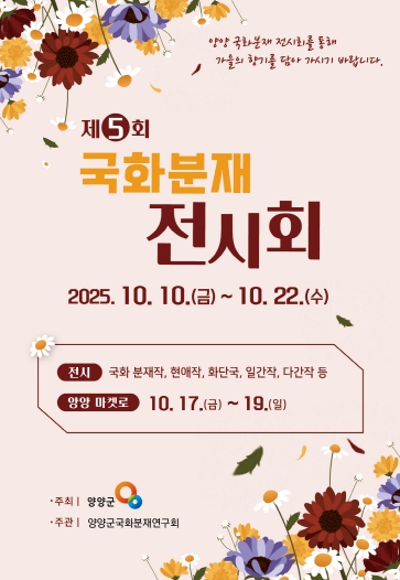 [뉴스시대=김정희 기자] 양양군 국화분재연구회(회장 윤종욱)는 오는 10일부터 22일까지 13일간 양양군농업기술센터에서 ’제5회 국화분재 전시회‘를 개최한다.