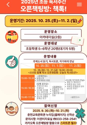 [뉴스시대=김정희 기자] 춘천교육문화관은 책 읽기 좋은 계절인 가을을 맞아 오는 10월 25일, 10월 28일부터 11월 2일까지 초등학생 5~6학년 학생 20명을 대상으로 초등 독서주간 ‘오픈책팅방 책톡!’을 운영한다.