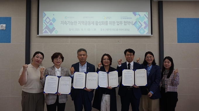 [뉴스시대=김정희 기자] 제주연구원(원장 유영봉) 제주사회복지연구센터(센터장 오윤정)는 2025년 10월 17일, 지속가능한 지역공동체 활성화를 위해 제주특별자치도 지속가능발전협의회, 일배움터, 제주특별자치도 마을만들기종합지원센터와 업무협약을 체결했다.