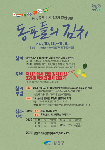 [뉴스시대=김정희 기자] 광주 광산구가 13일부터 11월 18일까지 전국 곳곳에 거주하고 있는 동포들을 대상으로 ‘전국 동포 김치담그기 경연대회_동포들의 김치’를 개최한다.