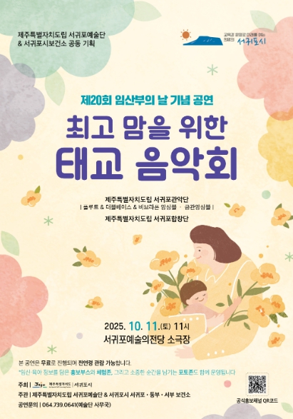 [뉴스시대=김정희 기자] 서귀포시는 오는 10월 11일 11시 서귀포예술의전당 소극장에서 제주특별자치도립 서귀포예술단과 서귀포보건소가 공동으로 주관하는 제20회 임산부의 날 기념 공연 '최고 맘을 위한 태교음악회'를 개최한다.