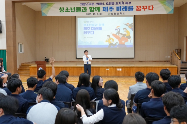 [뉴스시대=김정희 기자] 오영훈 제주특별자치도지사는 2일 남원중학교(교장 오경석)를 찾아 전교생을 대상으로 특별강연을 열고, “남원과 제주를 넘어 아시아, 나아가 우주까지 여러분의 무대가 돼야 한다”며 청소년들의 꿈과 도전을 격려했다.