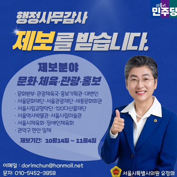 [뉴스시대=김정희 기자] 서울특별시의회 문화체육관광위원회 유정희 의원(더불어민주당, 관악4)은 10월 14일부터 11월 4일까지 시민 의견을 직접 접수받는 ‘행정사무감사 시민제보창구’를 운영한다고 밝혔다.