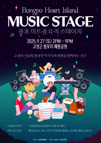 고성문화재단 관계자는 “도시에 없는 낭만을 표방하는 봉포하트섬 뮤직 스테이지는 고성 남부권만의 특색과 감성을 담아 누구나 즐길 수 있는 음악공연”이라며 “가을밤 해풍공원에서 많은 분이 함께해 주시길 바란다.”라고 전했다.